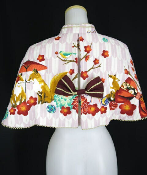 ■商品説明■ 原宿店グランバザール限定、矢羽柄の生地に、梅にうぐいす、狐が描かれたケープです。